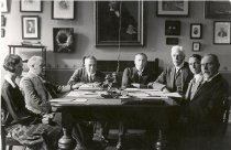Møde - Møde holdt på Den Polytekniske Læreanstalt i Sølvgade, København, d. 22. juni 1928 på professor i fysik og direktør for læreanstalten P.O. Pedersens kontor. Blandt deltagerene ses kemiker S. P. L. Sørensen, ingeniør og direktør for Industrirådet G. E. Hartz og industrimanden T. B. Thrige.